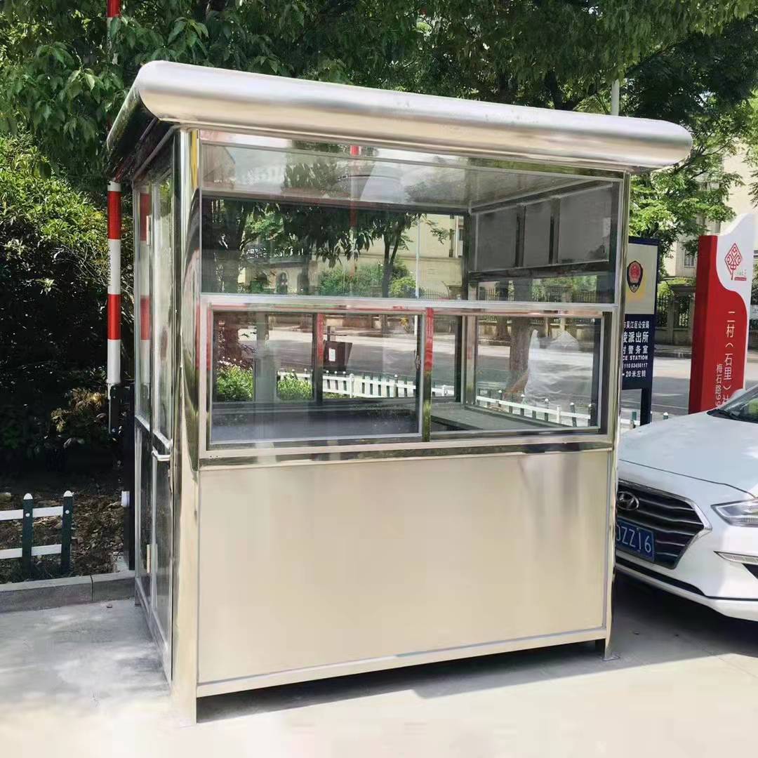 市面上的不锈钢材质岗亭应该称之为“岗亭行业的诺基亚”—产品质量没有问题,但外观已无法满足现代人的需求了,普通材质的不锈钢(也称原色不锈钢),根据其表面的形式不同,常会分为亮面、拉丝、镜面及磨砂等。不锈钢(Stainless Steel)的全称是不锈耐酸钢,因此其耐腐蚀性一直是其核心竞争力,还有就是其可塑性较高,可以制作出更多造型,作为岗亭类型中的“资历*老”的岗亭类型,不锈钢岗亭依旧深受许多对岗亭外观要求较朴素、对抗腐蚀性要求较高的场所喜爱,如部队站岗、停车场收费、潮湿地区、化工及化肥厂等